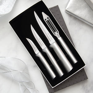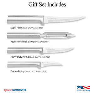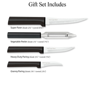 This 4 Piece Gift Set Includes: Granny Paring, Heavy Duty Paring, Super Parer, Vegetable Peeler