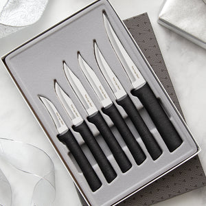 To assure customers get the best knives available, our blades are crafted from surgical-quality, T420 high-carbon stainless steel for a lifetime of durability then hollow ground for incredible sharpness. When needed, non-serrated, hollow-ground blades can be easily re-sharpened using Rada's Quick Edge Knife Sharpener. All pieces in this set except the Serrated Regular Paring knife can be sharpened.