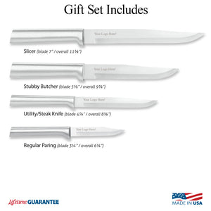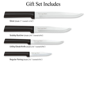 Our Starter Plus Gift Set will make everyone happy! This four-piece set is the perfect union of knives - the Regular Paring, Utility/Steak, Stubby Butcher, and Slicer - all designed to last a lifetime. Like all our gift sets, this set is packaged in an attractive gift box (no wrapping paper needed).