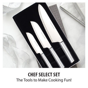 This Chef Select Gift Set includes three knives that are highly regarded by novice and professional cooks alike. All three knives, often compared to Japanese santoku knives, are great for those who want high-quality, impressive kitchen prep tools that will last a lifetime. Ideal set of knives for the serious cook or chef.