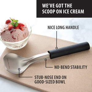 Our Ice Cream Scoop has everything you needed to dig into a big tub of the cold stuff. It'll take on the hardest ice cream and it WILL NOT BEND! The 4½" handle is comfortable to use and keeps knuckles clean when you're digging into the ice cream bucket. The bowl features a stub-nose end which ensures you can scoop ice cream without letting it set on the counter to soften first.